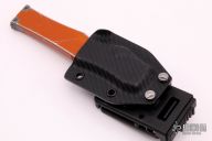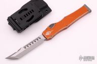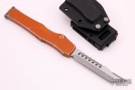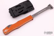 This Halo VI by Microtech Knives features an Apocalyptic finished Hellhound blade with satin flats and notched thumbrest. The handle has a distressed orange aluminum frame and Apocalyptic finished titanium charging handle. No safety. Comes with a kydex sheath with belt clip, original box and papers. Dated 01/2019 and s/n 089. Excellent condition.