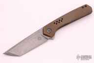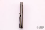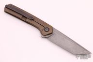 This Slimtoe Flipper by Tuff Knives features a dark wash finish tanto blade with notched flipper tab. The handle has an orange peel finished, anodized and tumbled titanium frame, black titanium backspacer and tip up pocket clip with hidden screws. Excellent fit and finish. Dead center blade seating, smooth action and nice detent. Includes COA dated 2021. Excellent Condition.