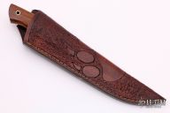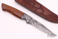 This Knife by SMID Damascus features a Firestorm Mosaic Damascus blade with false top edge and notched thumbrest, .212" blade stock and .962" blade depth, integral bolsters with hidden tang construction. The handle has Mahogany wood scales with a brass lanyard hole. Comes with a hand tooled brown leather sheath. Comes with COA. New from maker.