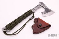 The Raven is a full custom nordic inspired bearded ax. Forged from super tough 4140 steel, it is a true working ax, not just a safe queen. The neck features a Viking knotwork design forged into the steel. The handle is wrapped in paracord. It comes with a custom leather scabbard. The Raven is designed, forged, and finished by crew member Reid Carmack. Comes with COA. Excellent condition.