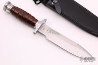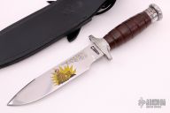 This Survival Knife by Garcia features a mirror finished spear point blade with sawteeth on the spine, .152" blade stock and 1.472" blade depth, hidden tang construction. The handle has an aluminum guard, stacked leather hollow handle and removable aluminum butt cap, has storage area in handle. Excellent condition. Handle and blade have been engraved, the blade has been pained with American troops raising the flag. Comes with a black leather sheath. Excellent condition.