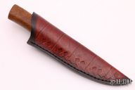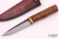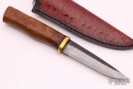 This Custom Pukko by Murad Custom Knives features a drop point blade with nice hamon, .150" blade stock and 1.107" blade depth, hidden tang construction. The handle has a brass guard with teak burl wood grip. Comes with a hand tooled leather sheath and COA. New from maker.