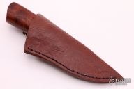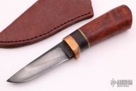 This Custom Hunter by Last Knives features a drop point blade with nice hamon, .239" blade stock and .987" blade depth, hidden tang construction. The handle has a copper guard with red Amboyna wood grip and brass/wood spacers. Comes with a leather sheath and COA. New from maker.