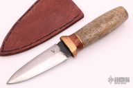 This Custom Dagger by Last Knives features hand rub satin finished double edged blade with .231" blade stock and 1.239" blade depth, hidden tang construction. The handle has a copper guard with curly mango wood grip and brass/wood spacers. Comes with a leather sheath and COA. New from maker.