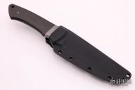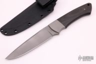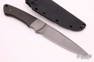 This fighter from Jens Anso features a bead blasted blade with false top edge and hidden tang construction.  .208" Blade Stock.  1.325" Blade Depth.  The handle has steel bolsters and a carbon fiber grip. Comes with a kydex sheath. Has a couple light scuffs on the blade otherwise the knife is in good condition.