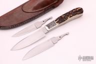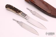 This knife by Master Smith Bailey Bradshaw features three satin finished blades that are all interchangeable.  The handle features engraved steel bolsters and stag scales.  Includes a brown leather sheath and a padded zippered case.  Light scratches are visible on the blade otherwise the knife is in excellent condition.  Very cool piece.