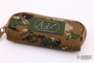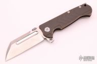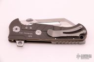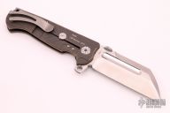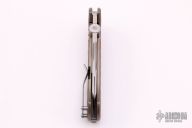This ADV Butcher framelock flipper has a satin finished blade with swedge, fullers, notched thumbrest and flipper. Handle has an anodized and bead blasted titanium frame, tumble finished titanium back spacer and tip up clip. Nice smooth action, detent, lockup and blade seating. Comes with zippered case. Excellent condition.