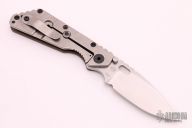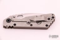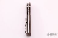 This SMF from Strider Knives features a stonewashed blade and textured brown G10 and stonewashed titanium handle and matching tip up titanium clip. Notches on thumbrest, rear of handle, and lockup. Includes Hinderer "Lock Bar Stabilizer" for maximum reverse lock retention. Excellent condition.