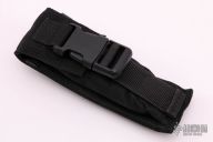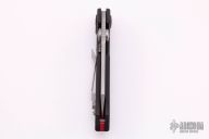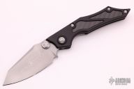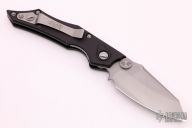 This Select Fire folder by Microtech features a bead blasted blade with dual thumb-studs and a notched thumbrest. The handle is black aluminum with carbon fiber inlays, stainless steel liner and pocket clip, tip up carry. #00112 and dated 07/2011. Includes original nylon sheath. Excellent condition.