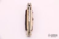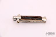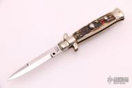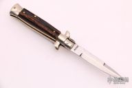 This Picklock Auto features a mirror finish spear point blade with fileworked spine. The handle consists of nickel silver bolsters and stag scales over brass D-Stamp liners and stainless steel backspacer. Steel push button. Has a few light scratches, otherwise excellent condition.