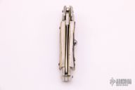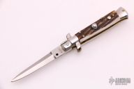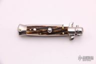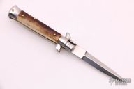This Swivel Bolster Auto features a mirror finish spear point blade. The handle consists of nickel silver bolsters and stag scales over brass D-Stamp liners and stainless steel backspacer. Steel push button. Has a few light scratches, otherwise excellent condition.