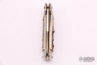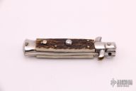 This Swivel Bolster Auto features a mirror finish spear point blade. The handle consists of nickel silver bolsters and stag scales over brass D-Stamp liners and stainless steel backspacer. Steel push button. Has a few light scratches, otherwise excellent condition.