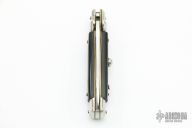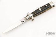 This Swivel Bolster Auto features a mirror finish spear point blade. The handle consists of nickel silver bolsters and buffalo horn scales over brass D-Stamp liners and stainless steel backspacer. Steel push button. Has a few light scratches, otherwise excellent condition.