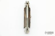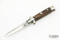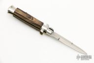 This Swivel Bolster Auto features a mirror finish spear point blade. The handle consists of nickel silver bolsters and buffalo horn scales over brass D-Stamp liners and stainless steel backspacer. Steel push button. Has a few light scratches, otherwise excellent condition.