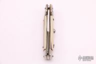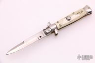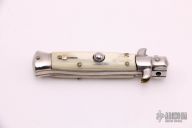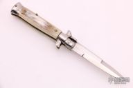 This Swivel Bolster Auto features a mirror finish spear point blade. The handle consists of nickel silver bolsters and honey horn scales over brass D-Stamp liners and stainless steel backspacer. Steel push button. Has a few light scratches, otherwise excellent condition.