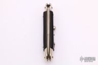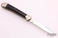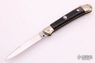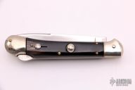 This Vintage Auto features a mirror finish spear point blade. The handle consists of nickel silver bolsters and buffalo horn scales over brass D-Stamp liners and stainless steel backspacer. Nickel silver push button. Has a few light scratches, otherwise excellent condition.