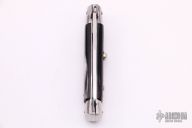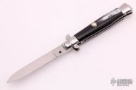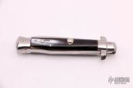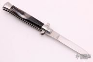 This Vintage Button Lock Auto features a mirror finish spear point blade. The handle consists of stainless steel bolsters and buffalo horn scales over stainless steel D-Stamp liners and stainless steel backspacer. Nickel silver push button. Has a few light scratches, otherwise excellent condition.