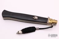 This large Picklock Auto from A.G.A. Campolin features a satin finished spear point blade with false top edge and fileworked spine. The handle is comprised of brass bolsters and wood scales over D-stamped brass liners with filework, and a fileworked stainless steel backspacer, even the spring on the inside is fileworked. Has some light scratches, otherwise excellent condition.