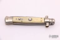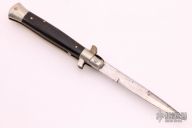 This pick lock auto by Latama is vintage. It features a mirror polished bayonet ground blade with a false top edge. The handle has nickel silver guard and rear bolster and honey horn and black horn scales, brass liners, steel backspacer with round lock tab. Has nickel silver button and safety. Has some oxidation and patina and some scratches, otherwise good condition.