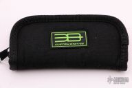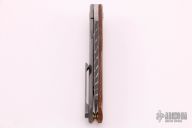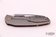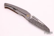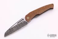 This Wolf folder by Emmanuel Le Brun features a Chad Nichols Starfire Damascus blade with thumbhole. The handle has a kevlar micarta and titanium frame with a matching tip up pocket clip.  Nice detent, lockup and blade seating. Has a light scuff on the clip, otherwise excellent condition. Comes with original zippered case.