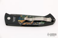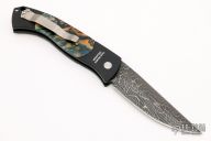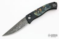 This AIK Custom Brend automatic by Pro-Tech features a Doug Ponzio Damascus blade. Black aluminum handle with custom mammoth tooth inlays done by Adams International Knifeworks, and a satin finished stainless steel clip, tip up carry. Push button has mammoth tooth inlay. Strong coil spring opening, perfect lock up and blade seating. Comes with original box and papers. Excellent condition.