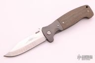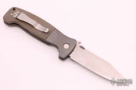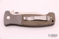 This is the CQC-12 Comrade, this design was based on Ernie's study of the AK-47 Bayonet. This is the same Model that Ernie himself carries. A true classic and a very rare opportunity for the serious Emerson collector. Satin finished clip point blade with thumbdisc and wave feature. The handle has bead blasted dovetailed titanium bolsters, green micarta scales, black G-10 backspacer, bead blasted titanium liners and a tip up stainless steel clip. Nice lockup, detent and blade seating. Comes with original box and papers. Has a very light scuff on the bolster, otherwise excellent condition.