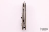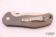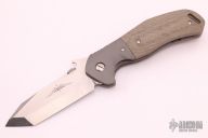 This custom S-Bulldog by Ernie Emerson features a satin finished chisel ground blade with notched thumbrest, thumbdisc and wave feature. The handle has dovetailed bead blasted titanium bolsters and liners, green canvas micarta scales, stainless steel tip up clip. Includes original box and papers. Excellent condition.
