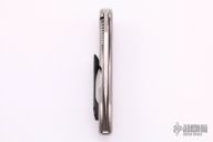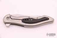 This Peligro R by Gerry McGinnis features a hand rub satin finished tanto recurve blade with false top edge and flipper. The handle has an orange peel titanium frame, tip up carbon fiber clip, and an orange peel finished titanium backspacer. Comes with a zippered case. Nice action, detent, lockup, and blade seating. Reads, "Peligro R 075 3-9-18 154V" inside frame. Excellent condition.