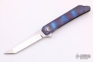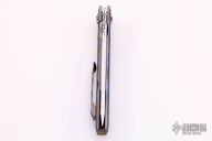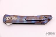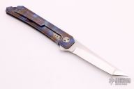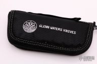 This Flipping Tanto by Glenn Waters features a hand rub satin finished multi-ground tanto blade with flipper, has laser engraved blade spine. The handle has a milled and orange peel finished titanium frame with flamed finish, matching backspacer with lanyard hole and tip up clip, stainless steel lockface insert with overtravel stop, custom titanium pivot. Comes with pivot tool, zippered case, original box and COA dated 2017. Excellent condition.