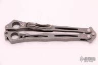 This Spyderfly Balisong by Spyderco features a satin finished spear point blade with a false top edge, reground by Jonny Rotten. The handles are tumbled stainless steel with a tip up clip (4-way reversible). Excellent condition. Comes with a cloth pouch.