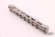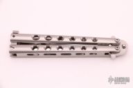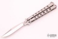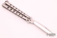 This Balisong from Roton Knives features a mirror polished blade. The handle is comprised of skeletonized integral stainless steel handle with machined T latch on pommel. Has some light scratches, otherwise excellent condition. Comes with a zippered case