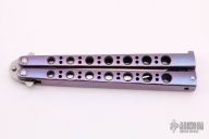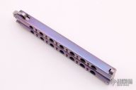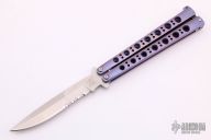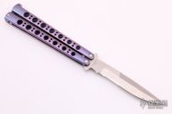 This Model 42AS Balisong features a satin finished partially serrated blade and anodized titanium handles with an orange peel finish. Has T-latch. Includes original sheath. Has a few light scratches, otherwise excellent condition.