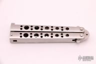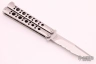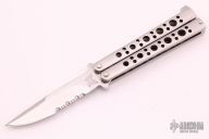 This is a Model 30 Bali-Song with a partially serrated blade and swedge. The handles are stainless steel with a T-latch. Has some light scratches, otherwise good condition. Comes with original sheath.