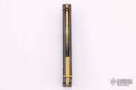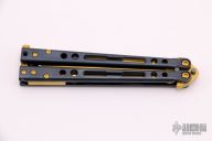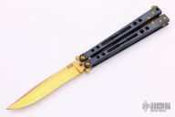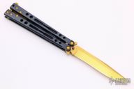 This Specter Elite Balisong from Jerry Hom features a gold satin finish recurve blade with swedge. The handle is comprised of blue titanium handles with gold satin titanium backspacers and T latch. Includes original box and paperwork. Excellent condition.