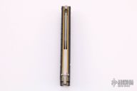 This Basilisk R from HOM Design features a bead blast finished, recurved clip point blade with swedge. The handle is comprised of black carbon fiber scales over anodized titanium liners and stainless steel backspacers. Steel and titanium T latch in pommel. Excellent condition. Comes with original box and COA.