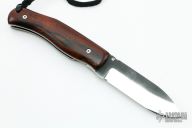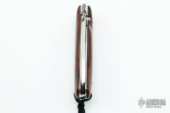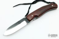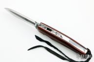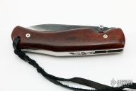 This linerlock folder by Citadel Knives features a drop point blade with polished grinds and forge finished flats and a single fileworked thumbstud. The handle has rosewood scales, polished stainless steel liners and backspacer with lanyard hole. Nice detent, lockup and blade seating. Comes with zippered case. Excellent condition.