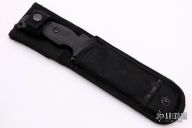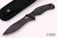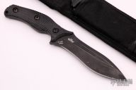 This 0100 fixed blade from Zero Tolerance is a Ken Onion design, features a black coated drop point recurve blade with fullers, .190" blade stock and 1.446" blade depth, full tang construction. The handle is comprised of milled black G10 scales with lanyard hole in pommel. Includes nylon sheath with kydex insert. Has been used and carried, has scuffs and scratches, has been resharpened, otherwise good condition otherwise. S/N 2928.