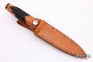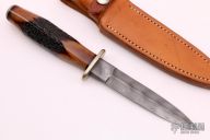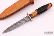 This Dagger by SR Johnson features a Damascus double-edged blade, .195" blade stock and .901" blade depth, hidden tang construction. The handle has a mokume guard, stag grip with red/black spacers and a mokume butt. Comes with brown leather sheath and zippered case. Excellent condition.