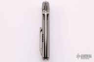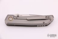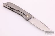 This Mula framelock by Enrique Pena features a hand rub satin finished drop point blade with swedge, notched thumbrest and dual thumbstuds. The handle has a bead blasted titanium frame with a titanium backspacer. Matching tip up titanium clip. Includes padded velcro case.  Excellent Condition.