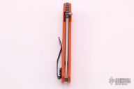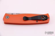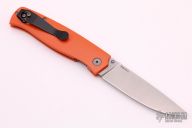 This Strizh by Alexander Cheberkov features a matte finished blade with notched thumbrest and a single thumbstud. The handle has anorange G10 frame with a black titanium pocket clip. Includes the original box and papers.