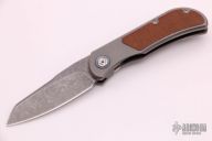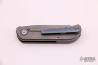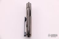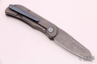 This EXK FL from Burger Knives features a tumbled finished sheepsfoot blade with notched thumbrest and front flipper. The handle has a bead blasted titanium frame with a micarta inlay, anodized titanium tip up clip and backspacer. Includes the original box.  Excellent Condition.
