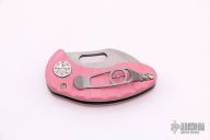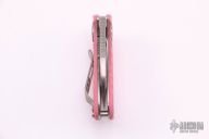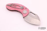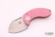 This Nano framelock by Curtiss Knives features a stonewashed sheepsfoot style blade with notched thumbrest and a thumbhole. The handle has pink G10 and tumbled titanium frame with a tip up clip. Excellent condition.