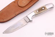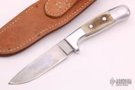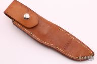 This Hunter by Ruana features a satin finished blade with false top edge with .180" blade stock and 1.047" blade depth, hidden tang construction. The handle has a cast aluminum grip with elk horn inlays. Comes with original brown leather sheath. Has some scratches and patina, otherwise good condition.