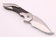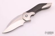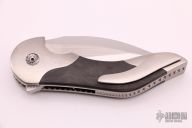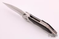 This Føniks Linerlock Flipper by Glenn Are Hovin features a hand rub satin finished blade with false top edge and flipper. The handle has orange peel finished titanium bolsters, front and rear, custom milled pivot, marble carbon fiber scales, titanium liners with jeweled interiors, milled titanium backspacer, tip up orange peel finished pocket clip with hidden screws. This knife's only hardware visible is the pivot, every other screw on the knife is hidden, pretty impressive and clean. Nice detent, lockup and blade seating.  Heavy lockstick.  New from maker. All the lines on this knife are super clean.