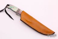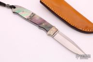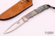 This Knife from Mr. Pease features a hand rub satin finished blade with sharpened top edge, .139" blade stock and .786" blade depth, full tapered tang construction. The handle has mokume bolsters, black lip pearl and abalone scales with mosaic pins. This piece is new from Mr. Pease and comes in custom leather sheath by TFC Leather.