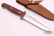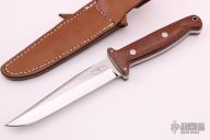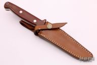 This fighter from Martin Knives features a mirror polished clip point blade with a sharpened top edge, .210" blade stock and 1.169" blade depth, full tang construction. The handle is comprised of brown linen micarta scales over black liners. Lanyard tube in pommel. SHas a couple light scratches, otherwise excellent condition.