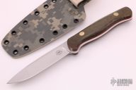 This Camp Kitchen by Chuck Schuette features a hand rub satin finished drop point blade with notched thumbrest, .162" blade stock and .901" blade depth, full tapered tang construction. The handle has green canvas micarta scales with a nickel silver pins and red liners. Comes with a kydex sheath. New from maker.