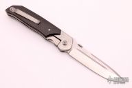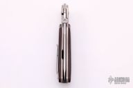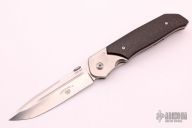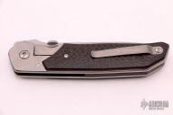 This Athena framelock folder by Bob Terzuola features a tumble finish blade with a notched thumbrest and thumbdisc. The handle has lightning strike carbon fiber scales, tumbled titanium liners, black backspacer and a tip up titanium clip. Smooth action. Nice blade seating, detent and lockup. Excellent condition.