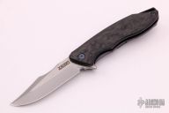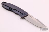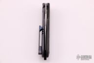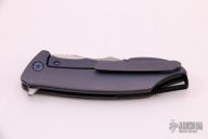 This S7 flipper by Michael Zieba features a two-tone blade with a notched thumbrest and a flipper. The handle has a marble carbon fiber and anodized titanium frame, black backspacer and an anodized titanium tip up clip with hidden screws. Nice detent, lockup and blade seating. Rides on bearings. Has stainless lockbar insert. Has a light scratch on the clip, otherwise excellent condition.
