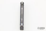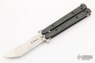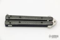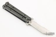 This rare Doucette balisong features a satin finished tanto blade with notched spine. The handle has silver lightning strike carbon fiber scales, anodized titanium liners, stainless steel spacers, and a mokuti T-latch. Beautifully crafted and in excellent condition.